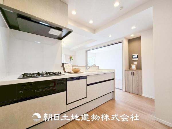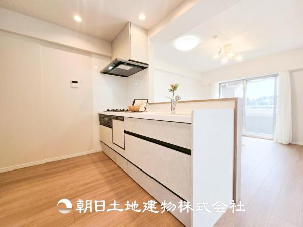 【ダイニング】温かい色合いのフローリングと清々しい爽やかなクロスが明るい空間を創り出しているダイニングキッチン。ゆっくりと過ごす空間に相応しく、ここで楽しむ時間が家族や友人との絆をより深めてくれそうで