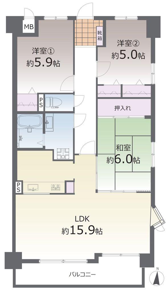販売戸数/総戸数 | 1戸/57戸 | 主要採光面 | 南 | ||