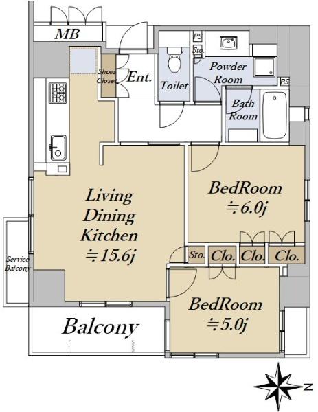 2LDK、価格6980万円、専有面積64.11㎡、バルコニー面積5.7㎡