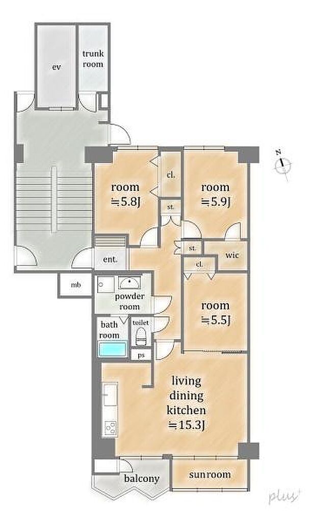 | 建物構造 | RC(鉄筋コンクリート) | 間取り詳細(帖) | リビングダイニングキッチン 15.3帖洋室 5.9帖洋室 5.8帖洋室 5.5帖 | ||