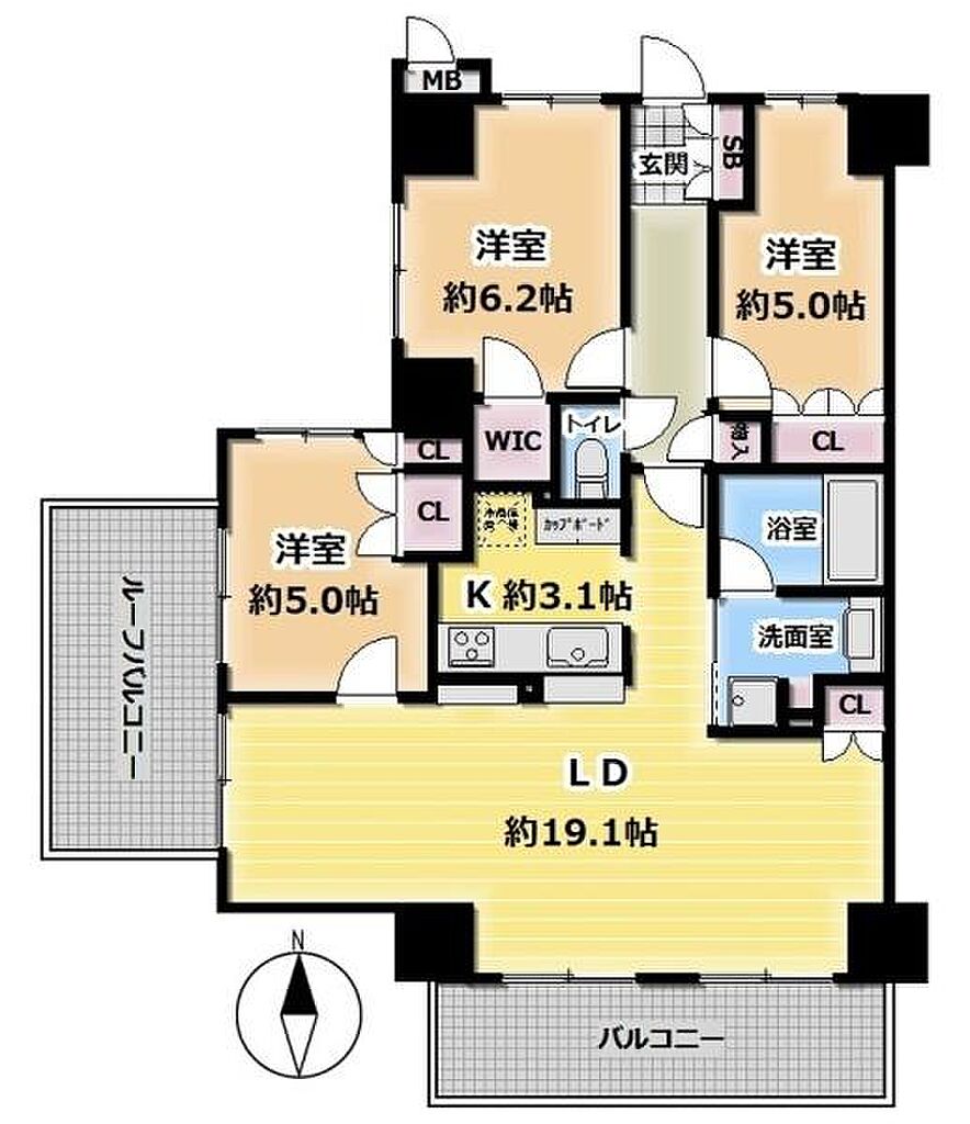 | 建物構造 | RC(鉄筋コンクリート) | 間取り詳細(帖) | リビングダイニング 19.1帖キッチン 3.1帖洋室 5帖洋室 5帖洋室 6.2帖 | ||