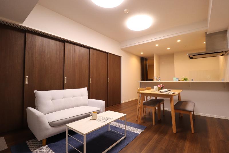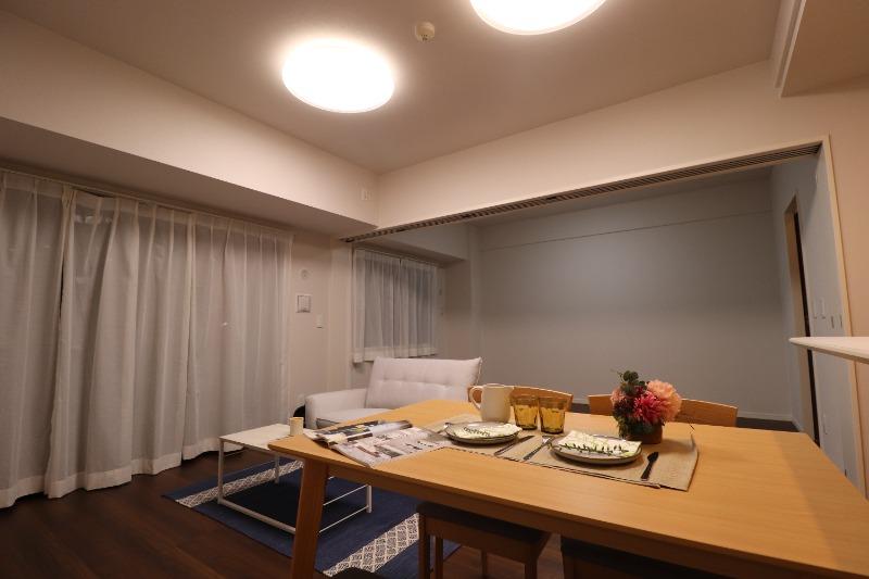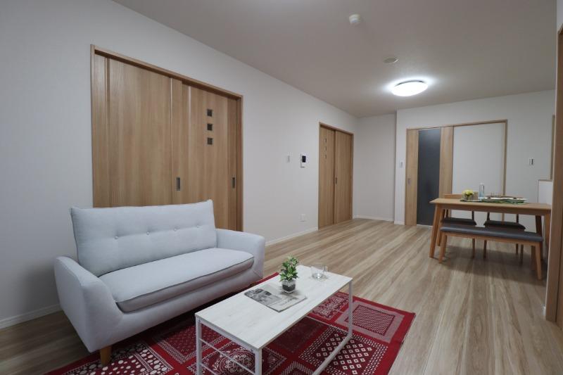 明るいフローリング17帖リビング。開放的な広さで家族がゆったり過ごせる空間です。新しい内装と美しい床材が心地よい時間を演出し、家具配置もしやすい使い勝手の良い間取りです。