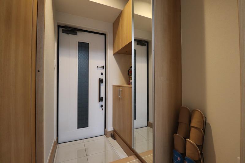 姿見付きのゆとりある玄関スペース。外出前の身だしなみチェックができ、収納も整った使いやすい空間です。明るく清潔感のある仕上がりで、毎日の出入りが気持ちよくなるポイントです。