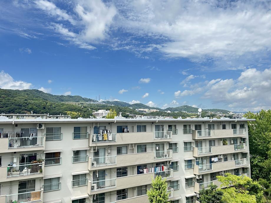 【住戸からの眺望(北側)】マンションのお部屋は、最上階の5階部分に位置しています。前面建物との距離があるので、開放的できれいな空の眺望を楽しめます。北の方角には、自然豊かな山々を望むことができます。