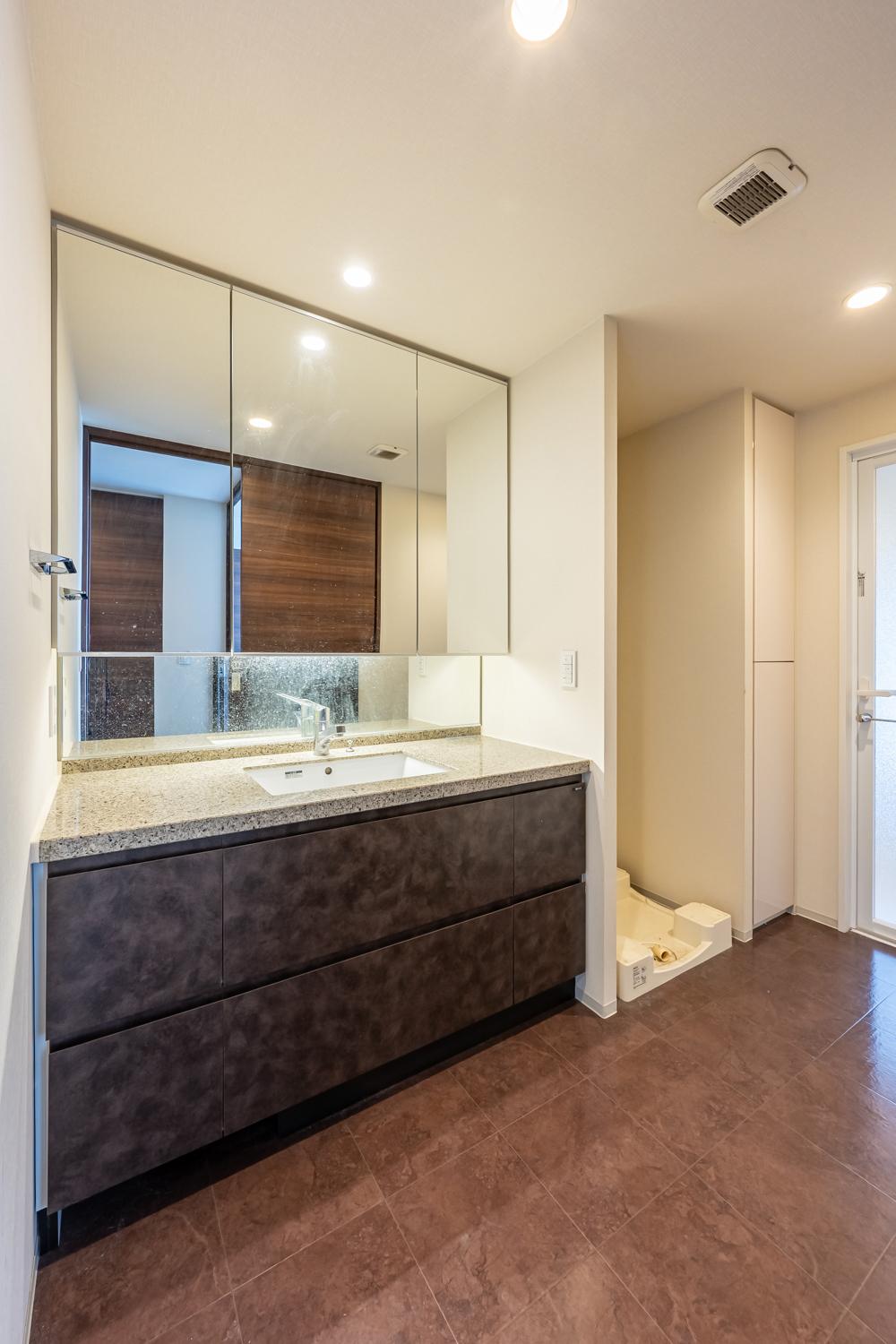 三面鏡付き洗面化粧台を備えた洗面室。鏡裏収納と引き出し収納で化粧品や日用品を整理しやすく、石目調天板はお手入れも簡単。洗濯機置場や収納が近く、家事動線にも配慮されています。