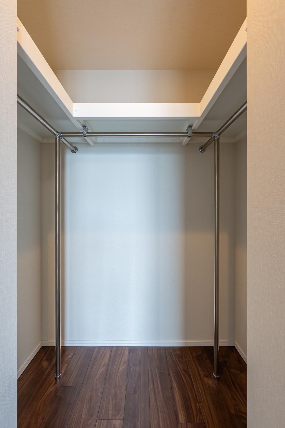 ウォークインクローゼットにはハンガーパイプと棚を完備。衣類を掛ける・畳む・小物を分けて収納でき、整理しやすく、居室をすっきり保てます。
