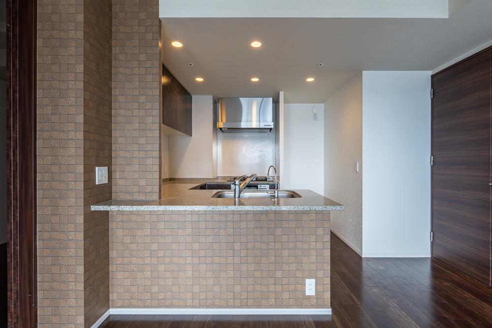 約3.7帖の対面式キッチンは吊戸棚を設けず、リビング側からも美しく見える開放的な設計。タイル調のアクセントが空間に上質な表情を添えます。