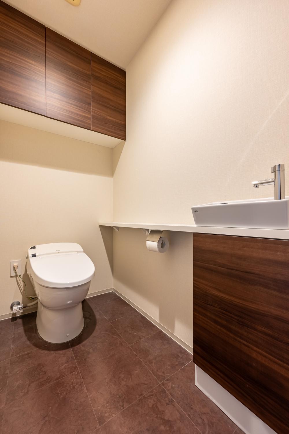 タンクレストイレを採用し、空間をすっきりと演出。操作しやすい壁掛けリモコンと独立した手洗い場を備え、使い勝手と清潔感に配慮した設計です。