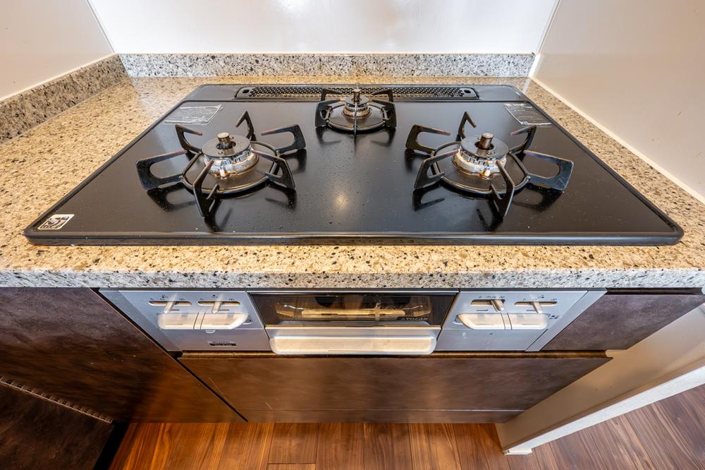 ガスコンロ3口+魚焼きグリル付き。同時調理ができ、焼き魚やグリル料理も手軽に楽しめます。毎日の調理効率を高める設備です。
