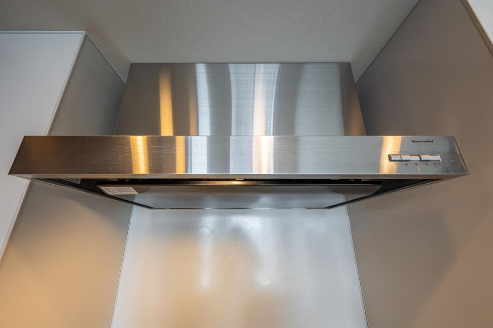 フラットタイプのレンジフードを採用。凹凸の少ない形状で油汚れが拭き取りやすく、日々のお手入れが簡単。すっきりとしたデザインで、キッチン空間をスマートに演出します。
