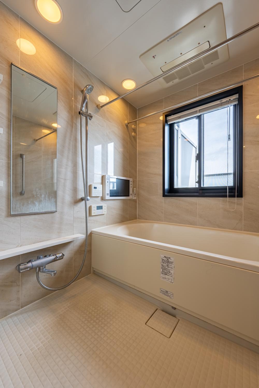 ミストサウナ付き浴室乾燥機を備えた浴室。窓を設けることで自然換気がしやすく、テレビも完備したホテルライクな空間です。くつろぎのバスタイムを日常の中で楽しめます。