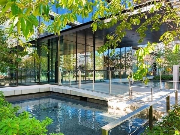 水のきらめきが美しい水盤が配置されたエントランス。都心にいることを忘れさせてくれる、癒しの空間です。【エントランス】