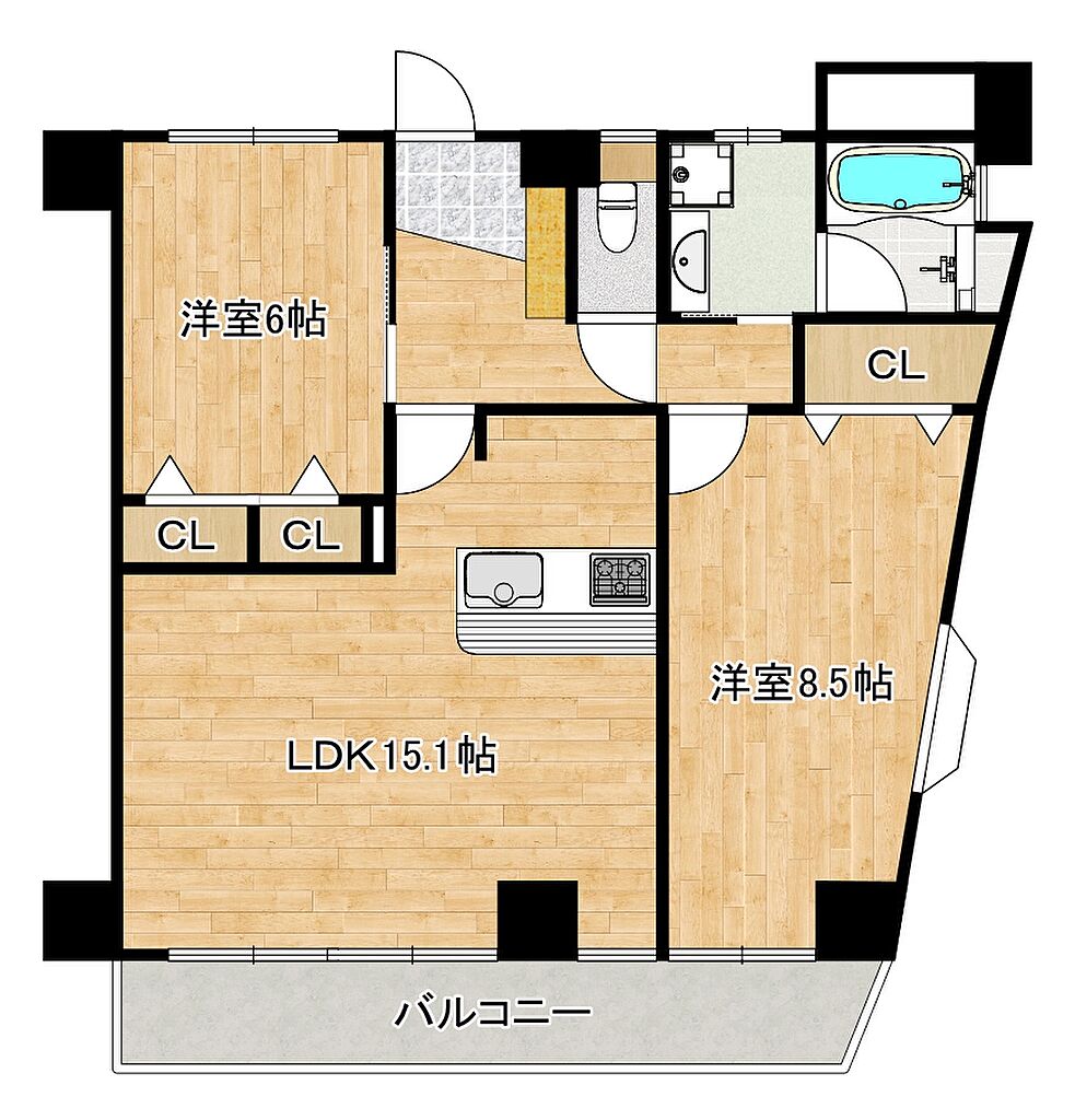| 建物構造 | RC(鉄筋コンクリート) | 間取り詳細(帖) | リビングダイニングキッチン 15.1帖洋室 8.5帖洋室 6帖全洋室収納有、南西面バルコニー有 | ||