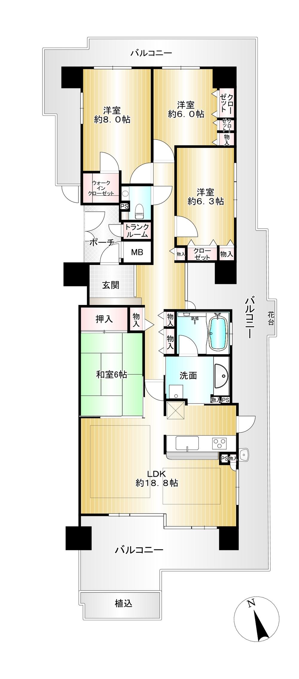 4LDK、価格4980万円、専有面積110.86㎡、バルコニー面積59.99㎡ 4面バルコニーに面する開放感のある住戸!全居室6帖以上のゆとりある間取り設計です。ご家族が集まるLDKは約18.8帖の広さ。南側・東側からの採光が確保された陽当り・風通しの良い空間です。