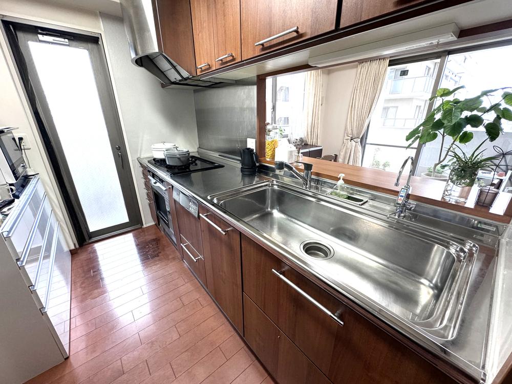 【キッチン】食器洗浄乾燥機付きシステムキッチンが採用されています。後片付けの時短が可能で、お手入れも簡単です。食後のひとときをゆっくりと過ごせそうです。勝手口からバルコニーに出入り可能です。