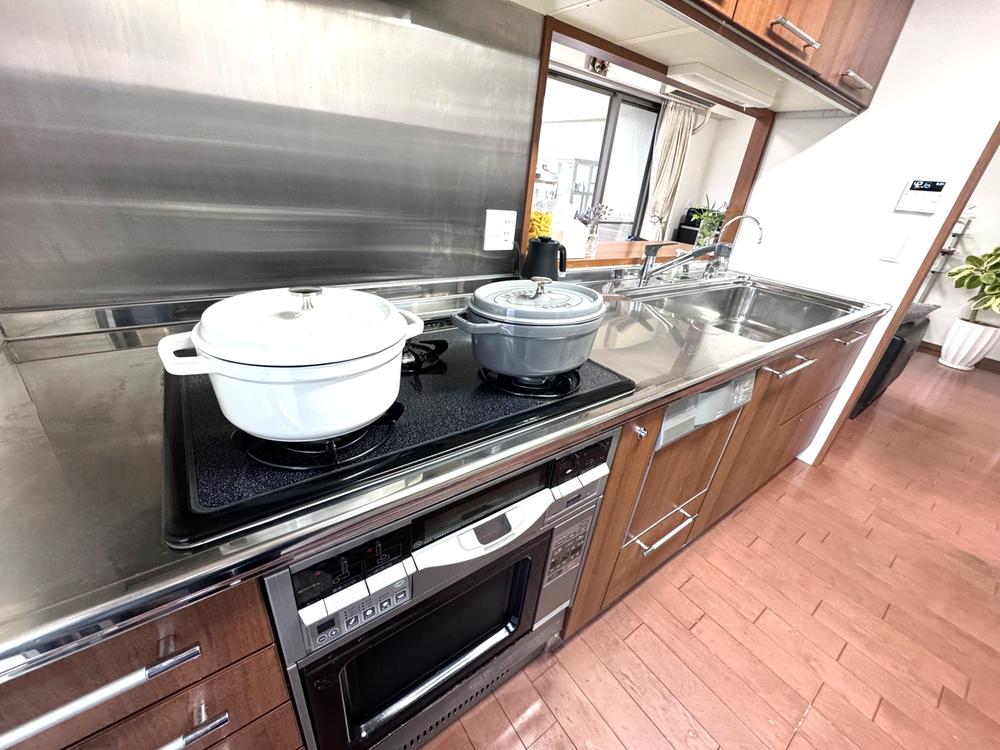 【キッチン】ご家族との会話が弾む対面式キッチン。グリル付き3口ガスコンロとオーブンレンジが搭載されているので、同時に複数の料理を作ることができます。