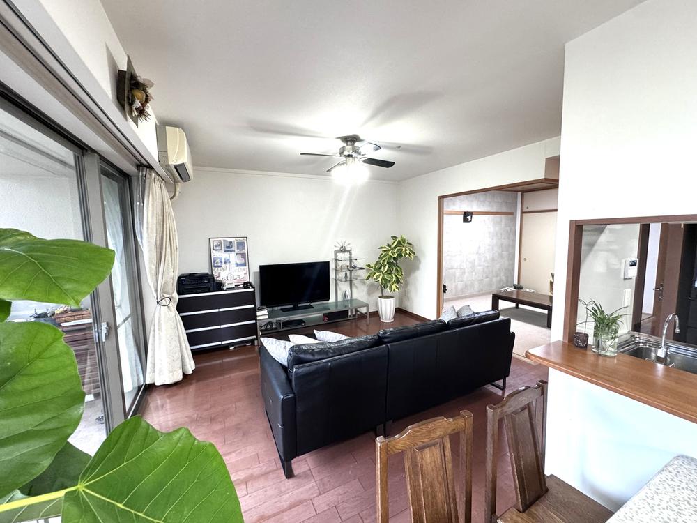 【LDK】2面バルコニーに面する開放感溢れるLDK。約18.8帖と、ご家族そろってテレビを観たり、団らんをしたり、思い思いに寛げる広さがあります。