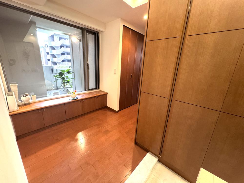 【玄関】玄関正面の大きな窓からバルコニーを望むことができます。開放感ある空間でお客様をお迎えしたり、ゆったりとした気持ちで帰宅したりできそうです。