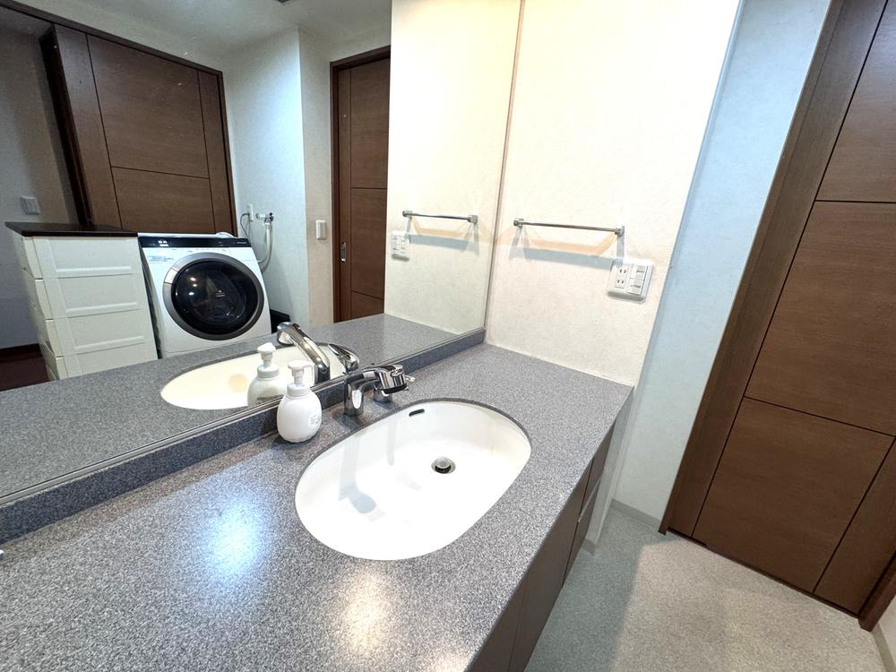 【洗面室】ホテルライクな大きな鏡付きのシンプルな洗面台が設置されています。洗面室はキッチンと廊下から出入り可能な2WAY仕様です。