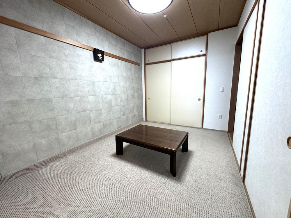 【和室/約6帖】LDKに隣接する和室は客間としてもおすすめです。壁紙一面が調湿や消臭の機能があるエコカラットに変更されており、過ごしやすい住空間です。押入れには寝具などを収納することができます。