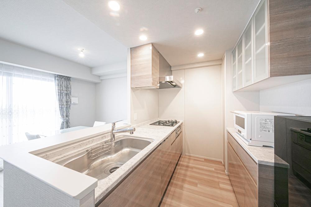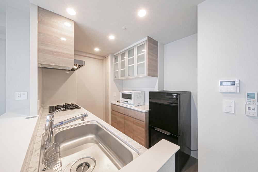 【キッチン】ダウンライト付きです。収納スペースとカップボードが備わっています。