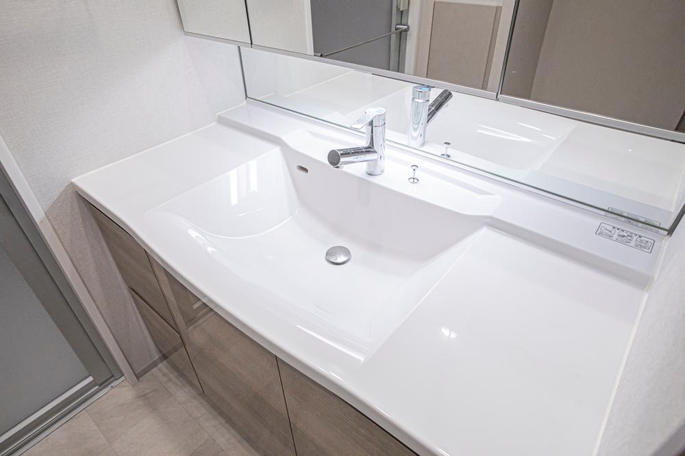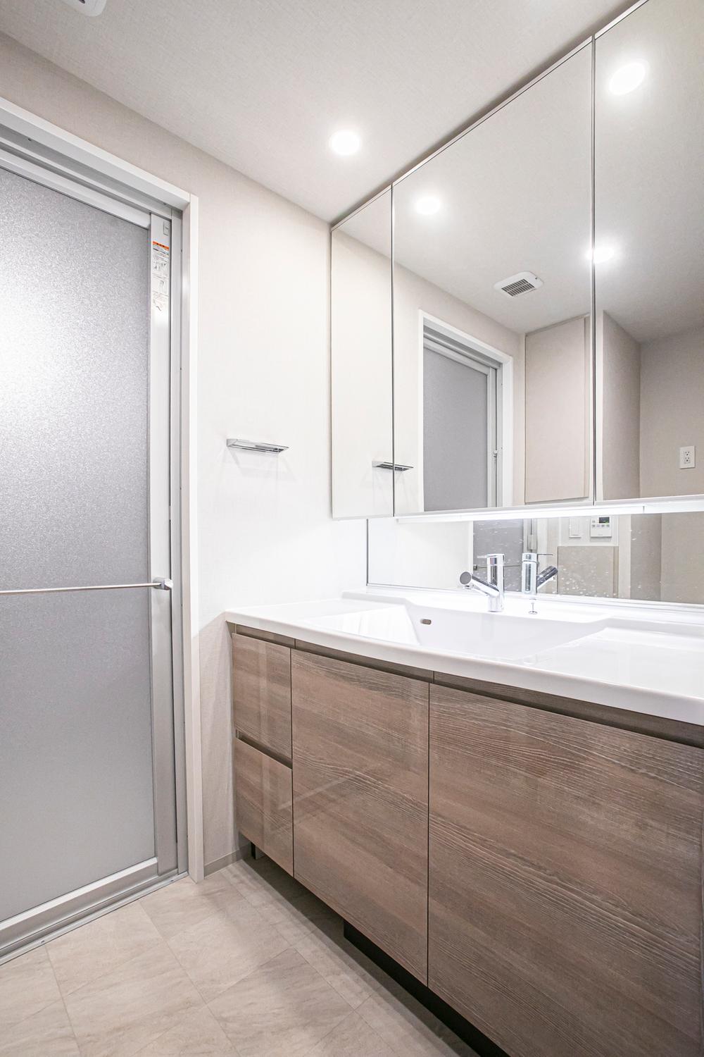 【洗面室】3面鏡+ミドルミラー付きの洗面化粧台有。ボウル下に収納スペースがあり、リネン類などを収納していただけます。