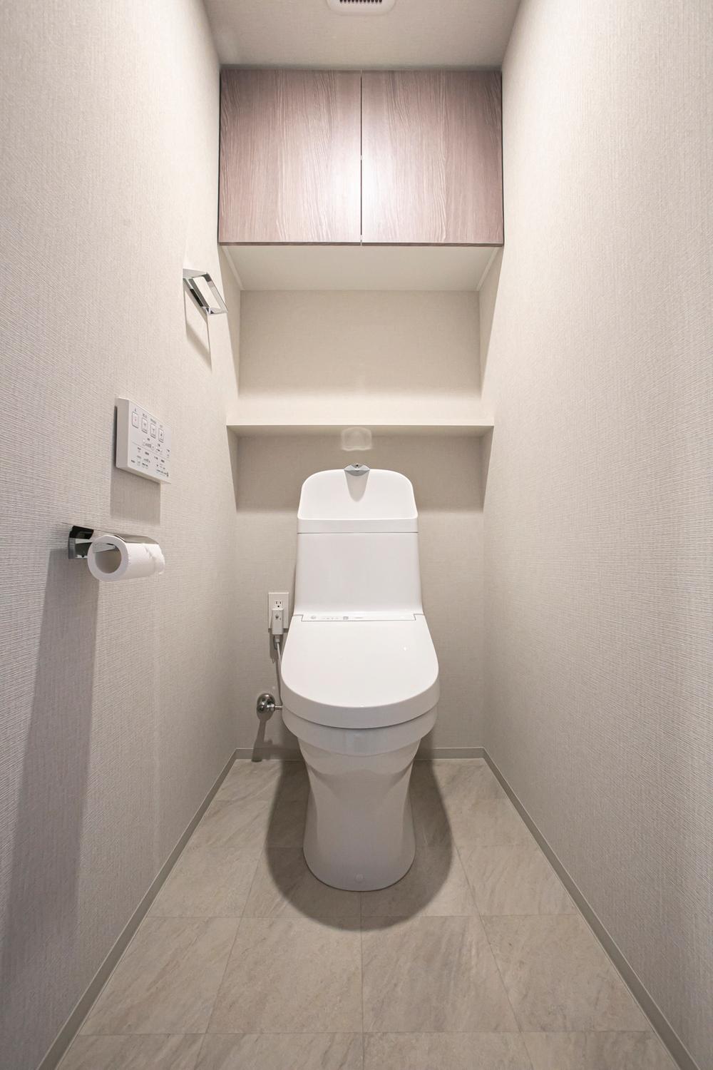 【トイレ】温水洗浄便座搭載。背面上部に吊戸棚があり、トイレットペーパー・掃除用品などを収納可能です。