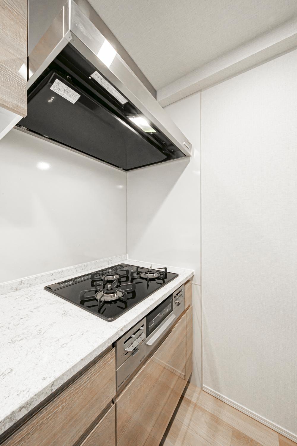 【ガスコンロ】グリル付き3口コンロ仕様で、料理の同時進行が可能です。