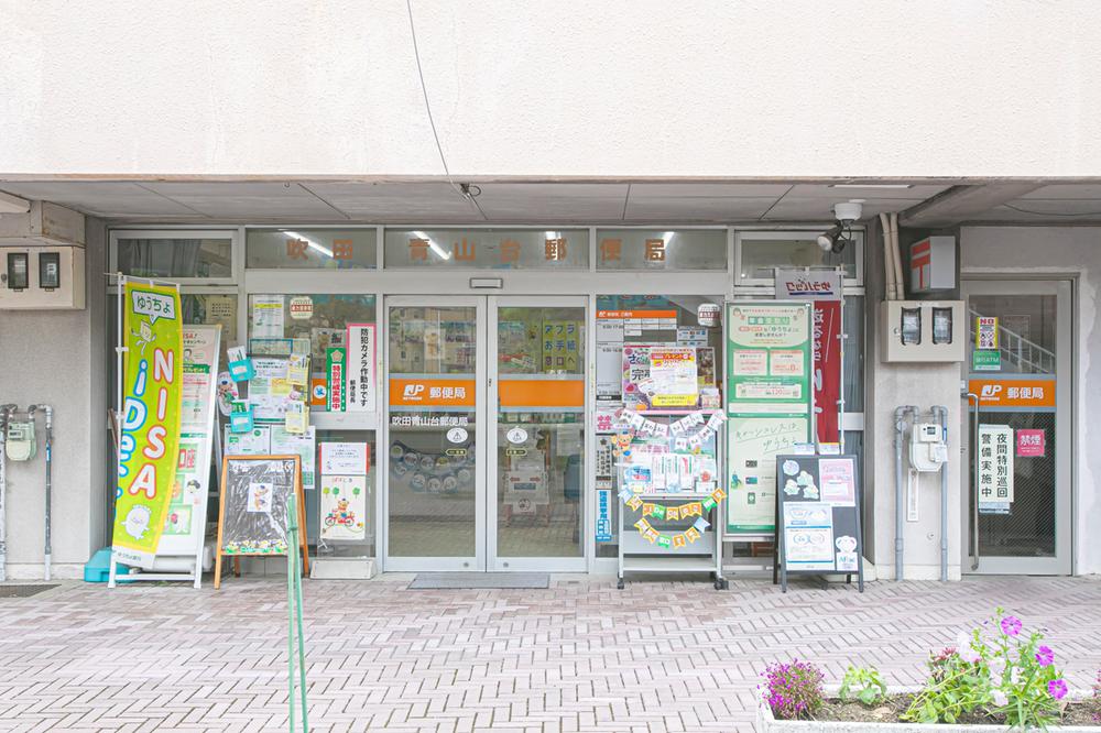 吹田青山台郵便局まで400m 徒歩5分。郵便・印紙・ゆうパック・国際郵便などの取り扱い有。平日の他、土日祝日に利用可能なATMが設置されています。駐車場は30台分です。