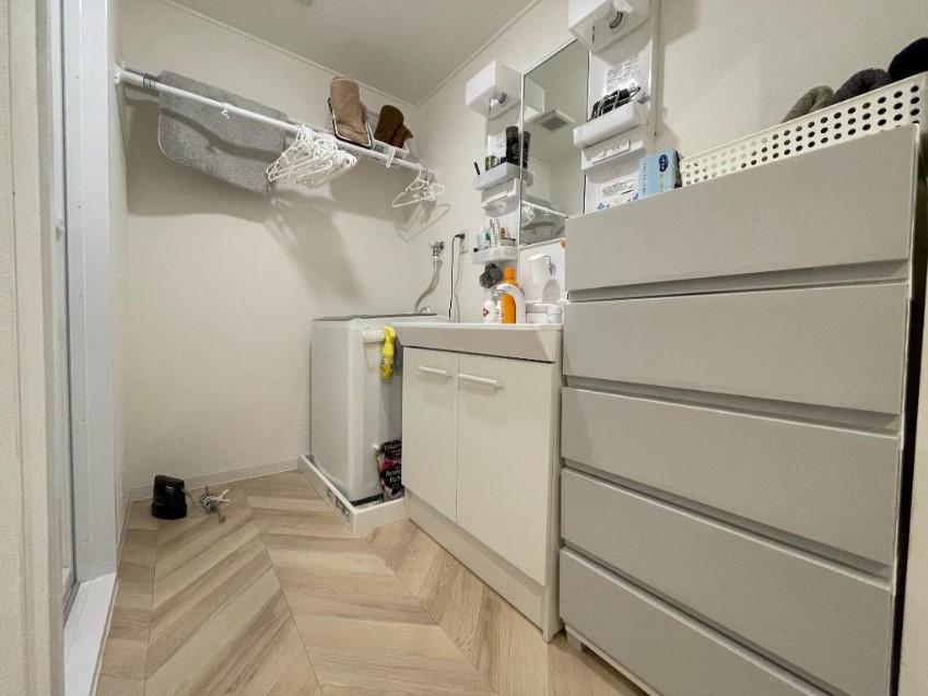 【洗面室】白いクロスとヘリンボーンの床がオシャレな洗面室です。2022年11月洗面台もリフォーム済です♪鏡の両脇と洗面台下に収納があり、洗面用具などを綺麗に片付けることができて嬉しいですね◎