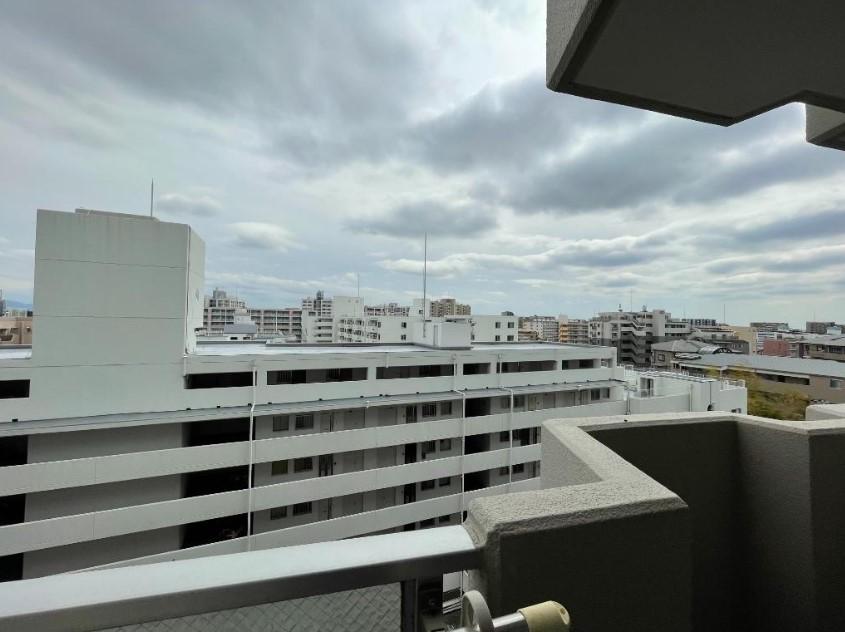 【バルコニー】8階南向きなので通風採光良好です。前面の建物から距離もあり、圧迫感はありません。空がしっかり見えて、お天気の確認ができます。晴れた日はお洗濯物も良く乾きそうで嬉しいですね◎