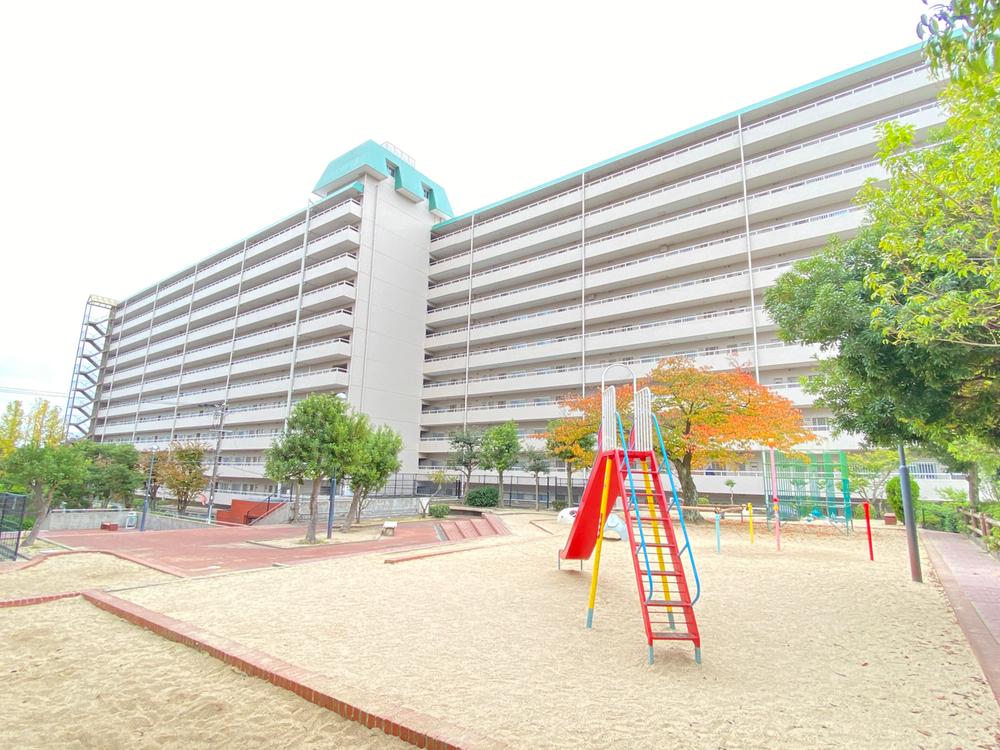 【外観】A棟は12階建てで、朝日プラザ千里の敷地の南側にあります。周辺は歩道が完備されています。敷地の西側には「新田南小学校」があり、お子さまの通学に優しいですね。敷地内公園で安全に遊べます。