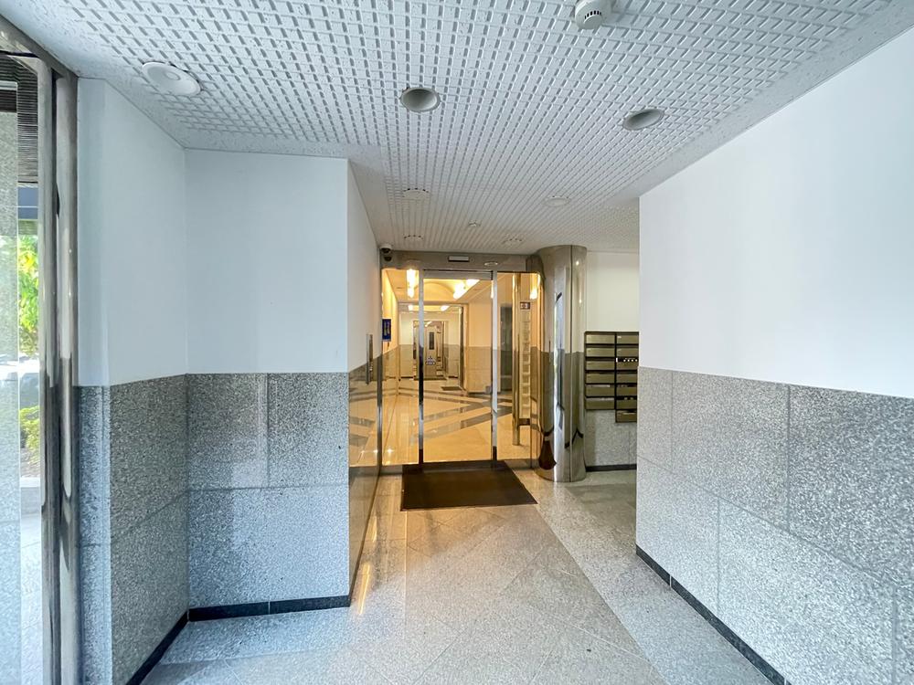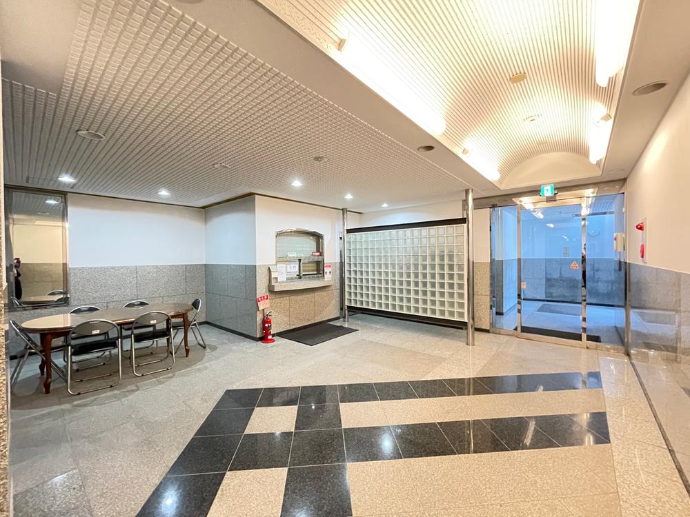 地下1階のロビーです。正面にエレベーターホール、手前がオートロックの入り口です。右手に管理人室もあります。地下なので窓があっても薄暗いですが、それ以上に照明がたくさんあるので明るくて防犯にも役立ちます