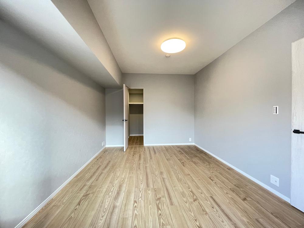 約7.5帖の洋室です。手前にバルコニーが、正面にはウォークインクローゼットがあります。バルコニーは南西方向ですが、建物が建っていてそれほど日当たりが良い訳ではないのでお昼間でも照明が必要かもしれません