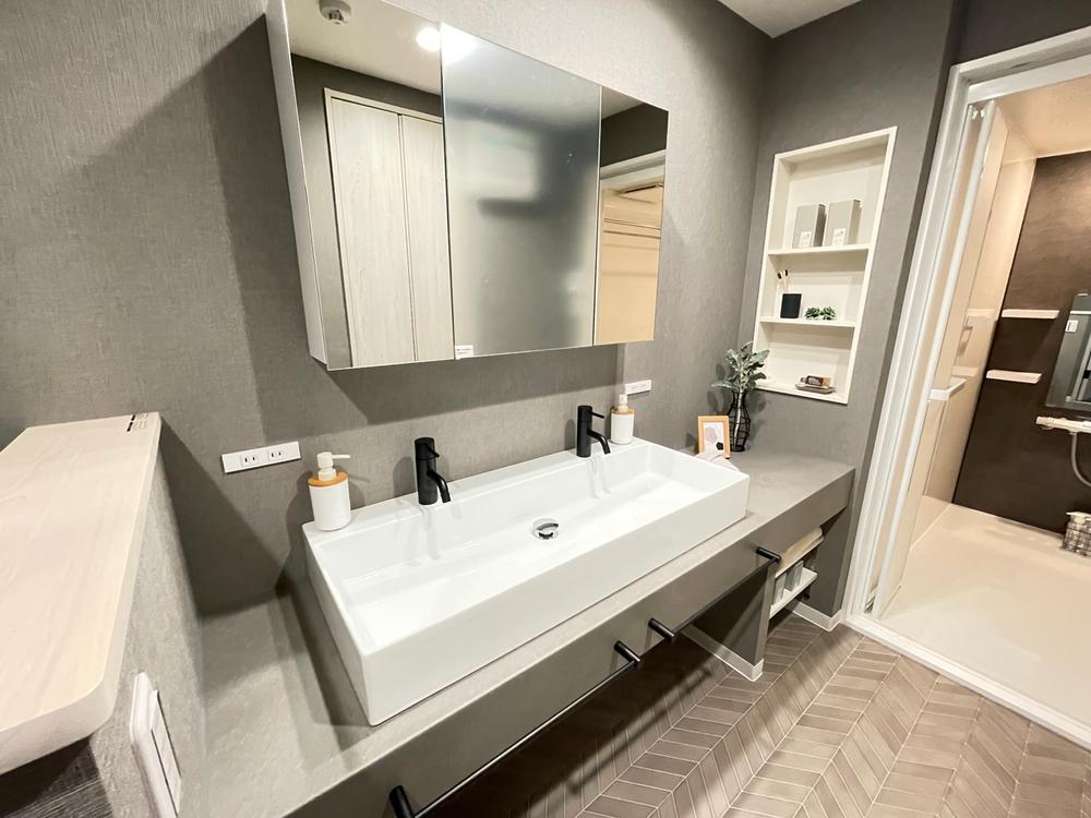 オリジナルの洗面台です。横に長く、蛇口が2つ付いています。2人同時に使えそうです。スタイリッシュで下には洗濯カゴなども置けそうです。洗面台自体の照明がなく洗面室の照明だけでは若干暗く感じます。