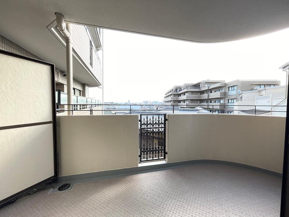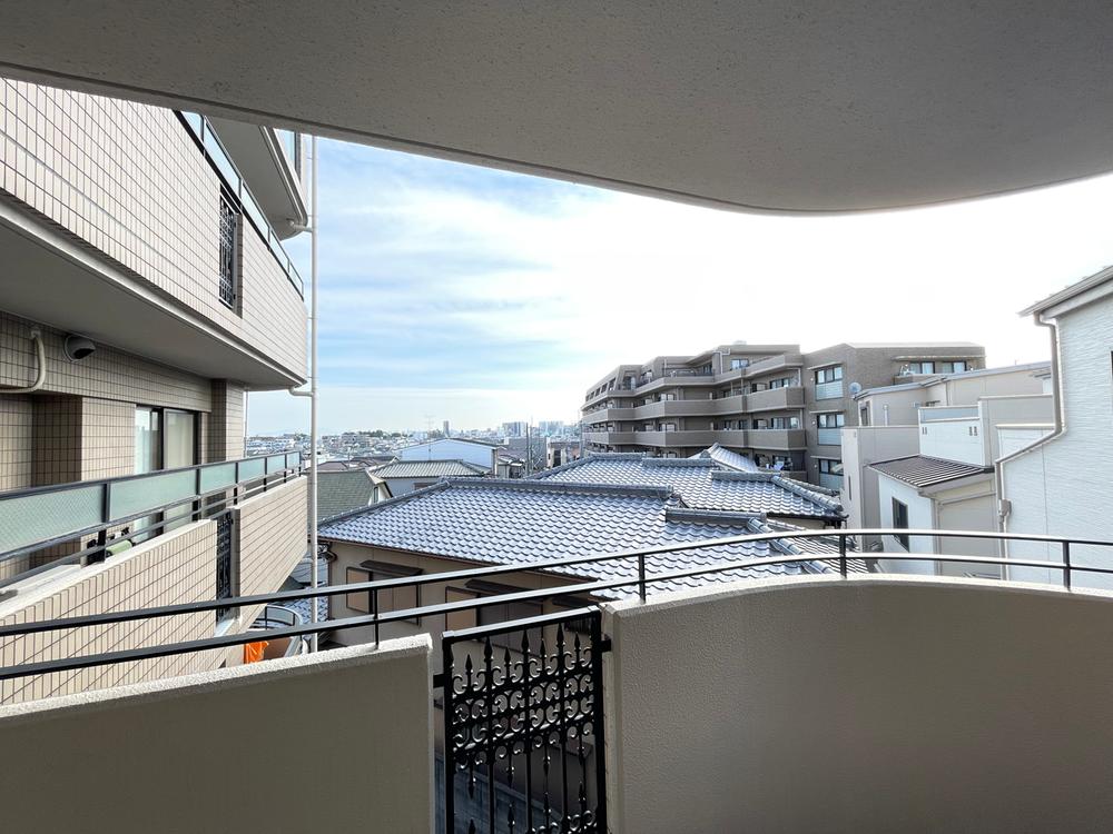 リビングに隣接するバルコニーからの景色です。左側は、同じマンションのお隣さんになります。目隠しが付いていますが、結構目線は気になります。正面は高い建物がないので、日当たりは良さそうですね