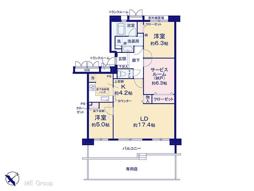 設備・サービス | バルコニー、フローリング、専用庭、床下収納、トランクルーム、浴室乾燥機、温水洗浄便座、バス・トイレ別、エレベーター | ||||