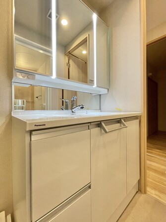 大きく見やすい三面鏡で清潔感ある洗面台は、身だしなみチェックや肌のお手入れに最適です。何かと物が増える場所だからこそ、スッキリと見映えの良い空間に拵えました。