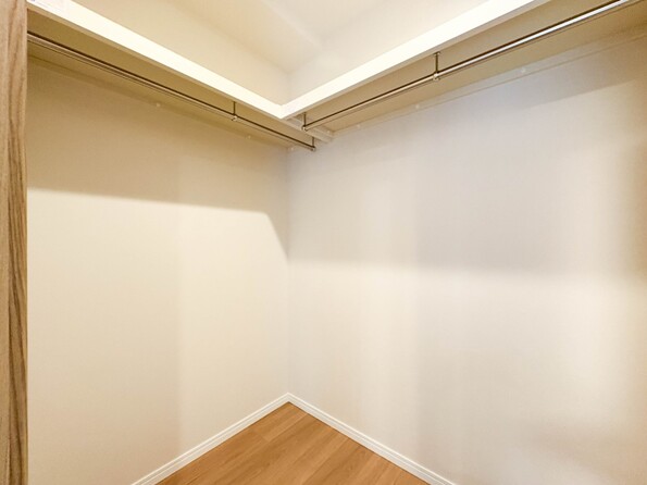 【WIC(ウォークインクローゼット)】 たくさんの洋服をかけてもシワになりにくいウォークインクローゼット。洋服以外にも、普段使わない家電やスーツケース、ストック品など何でも片付く嬉しい空間です。