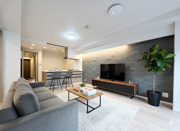 【LDK15.3帖】整然とした空間演出、快適な理想の暮らしの実現は家のみの拘りではなく、そこで暮らす方々にとって素敵な環境である。※現況の物件写真に、CGによる画像処理(家具等の配置)がされています。