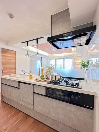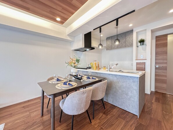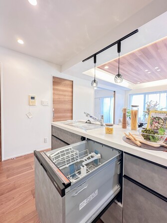 【キッチン】ナチュラルな自然光の中での調理。会話が弾む対面型キッチン。お洒落な食器類を余裕で収納できるスペース。動きやすい女性目線のキッチン動線。これからはお料理をつくる時間が劇的に変わります。