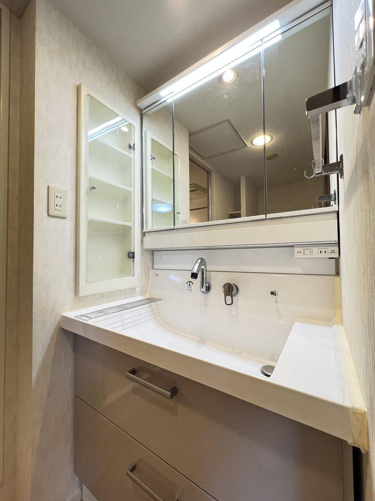 洗面台は三面鏡タイプ。いろいろな方向から確認ができるので大変便利です。鏡の後ろは収納スペースとなっており、ヘアケア用品や洗面用品などを収納することが出来るので洗面所まわりがスッキリします。
