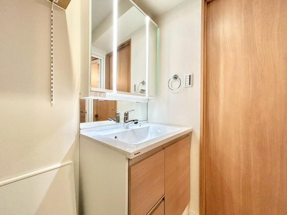 目線に合わせた三面鏡付洗面化粧台を採用しました。三面鏡の裏側には収納棚を確保。スキンケア用品やヘアケア用品などをすっきり整理できます。また収納棚を多く設けており、脱衣スペースを広く確保しております。