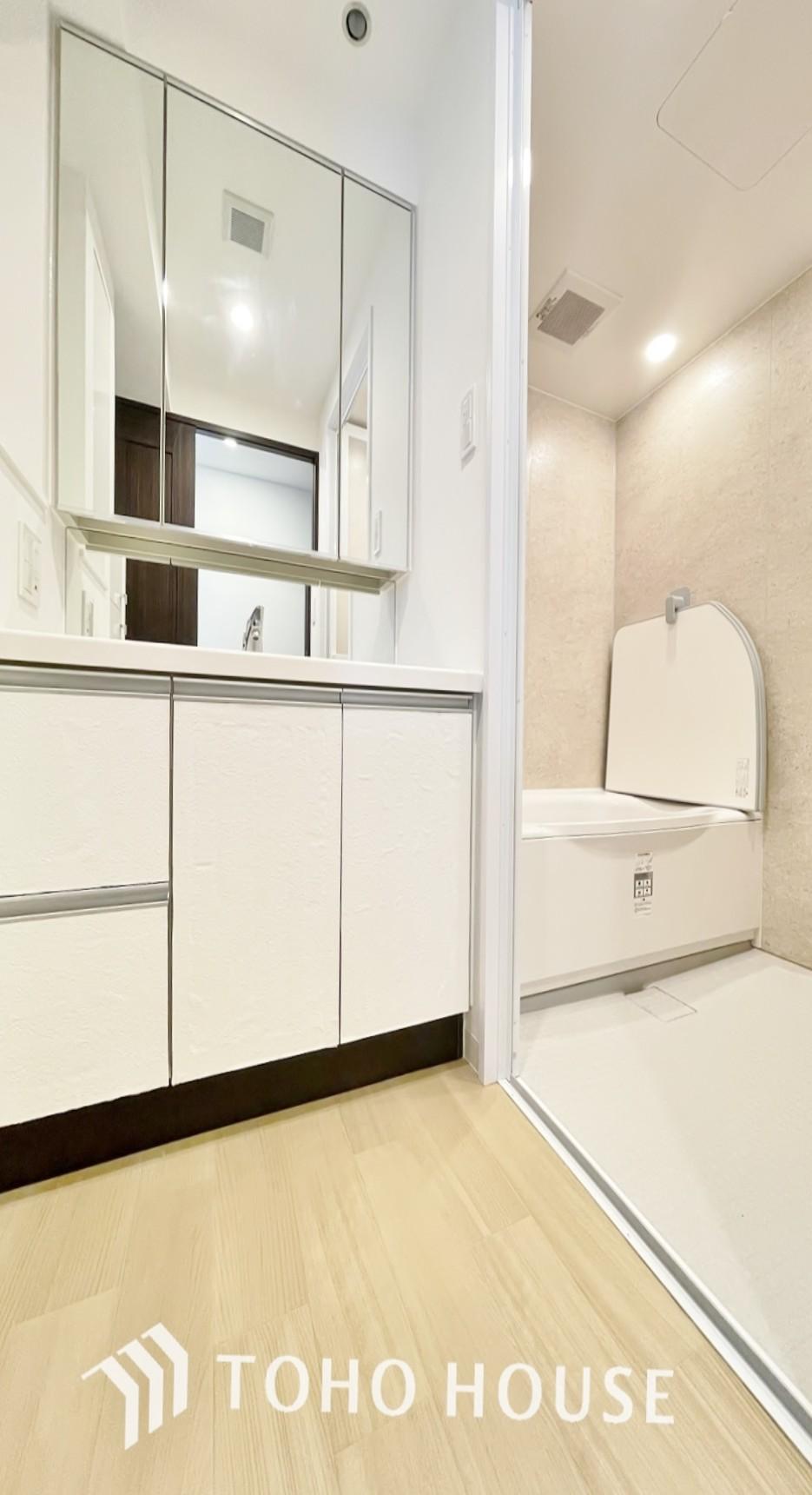 「洗面台」大きな鏡で朝の準備もばっちり。収納も多く、洗剤など日用品の保管にも便利です。