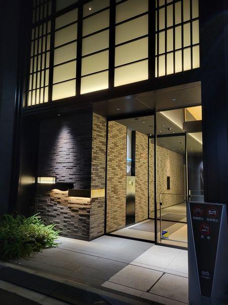 【エントランス】エントランスの夜の雰囲気です。天然石タイルを使用した重厚感のある外観・エントランスホールです。