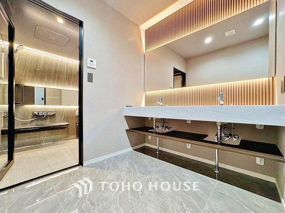 「洗面台」洗面台には三面鏡を採用。身だしなみを整えやすい事はもちろんですが、鏡の後ろに収納スペースを設ける事により、散らかりやすい洗面スペースをすっきりさせる事が出来るのも嬉しいですね。