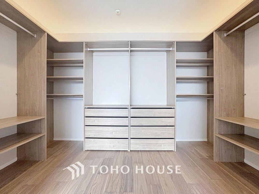 「たっぷり収納。ウォークインクローゼット」たっぷりと荷物が入るよう、ウォークインクローゼットを完備いたしました。画像と現地では大きさ、広さの感覚が違います。是非ご自分の目で確かめてください。