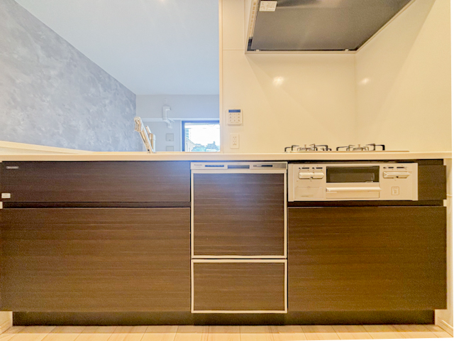 対面式のシステムキッチンが、家事をもっと楽しいひとときに変えてくれます。リビングを見渡せる安心感と、広い作業スペース、たっぷりの収納が充実。会話を楽しみながら、快適に料理ができる空間です。