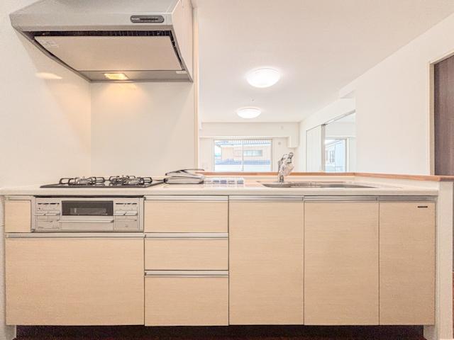対面式のシステムキッチンで、リビングを見渡しながら料理ができる開放感。広いカウンターと豊富な収納スペースが、調理をよりスムーズに。居心地の良い空間で、料理をしながらコミュニケーションが生まれます。