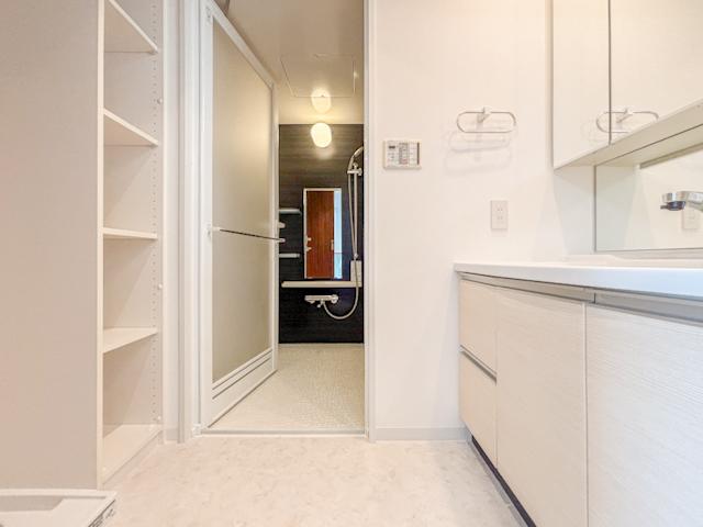 広々とした洗面脱衣所は、収納が豊富で家族みんなが使いやすい空間です。清潔感があり、日常の洗濯や着替えもスムーズに進みます。便利で快適な設計が魅力となります。